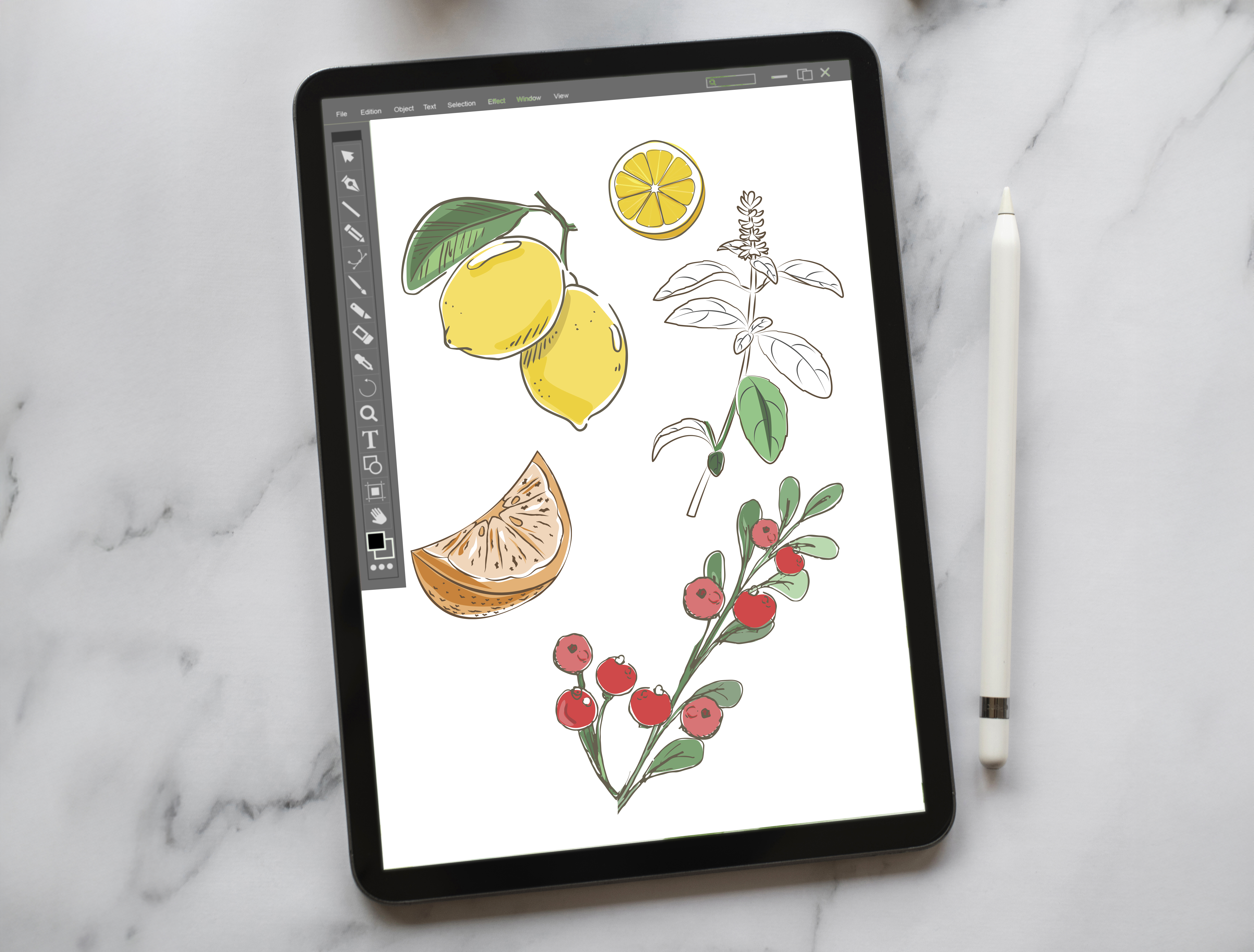 With the help of procreate and illustrator, I would sketch my plants/ flowers/ fruits on paper photograph the sketches and retrace them using procreate on my iPad. The outline of every plant flower or fruit is dark brown and pretty much the same width.