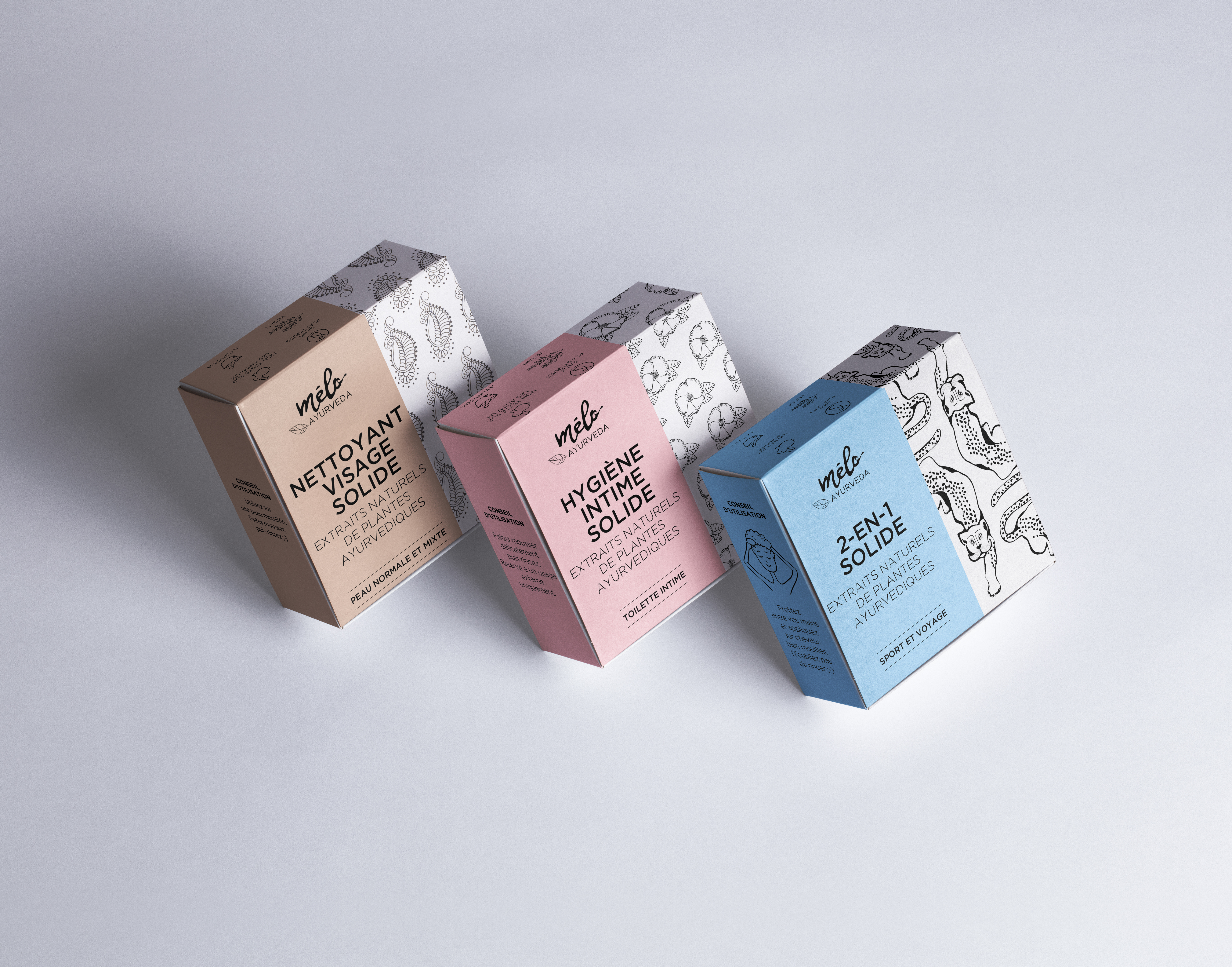 J’ai collaboré avec deux marques de produits naturels en développant leur univers packaging. Pour Melo Ayurveda, j’ai conçu les packagings de shampoings et savons, en traduisant visuellement l’identité ayurvédique de la marque. Pour L’Énergie de la Vie, j’ai réalisé les packagings des gammes d’huiles essentielles et de synergies, en travaillant la hiérarchie de l’information et la cohérence graphique.